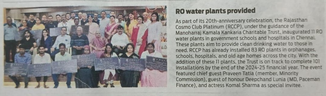 RCCP has adopted the social cause of providing clean drinking water through installation & maintenance of RO based water purification plants in schools, hospitals & other impactful mass public touch points like railway & bus stations.